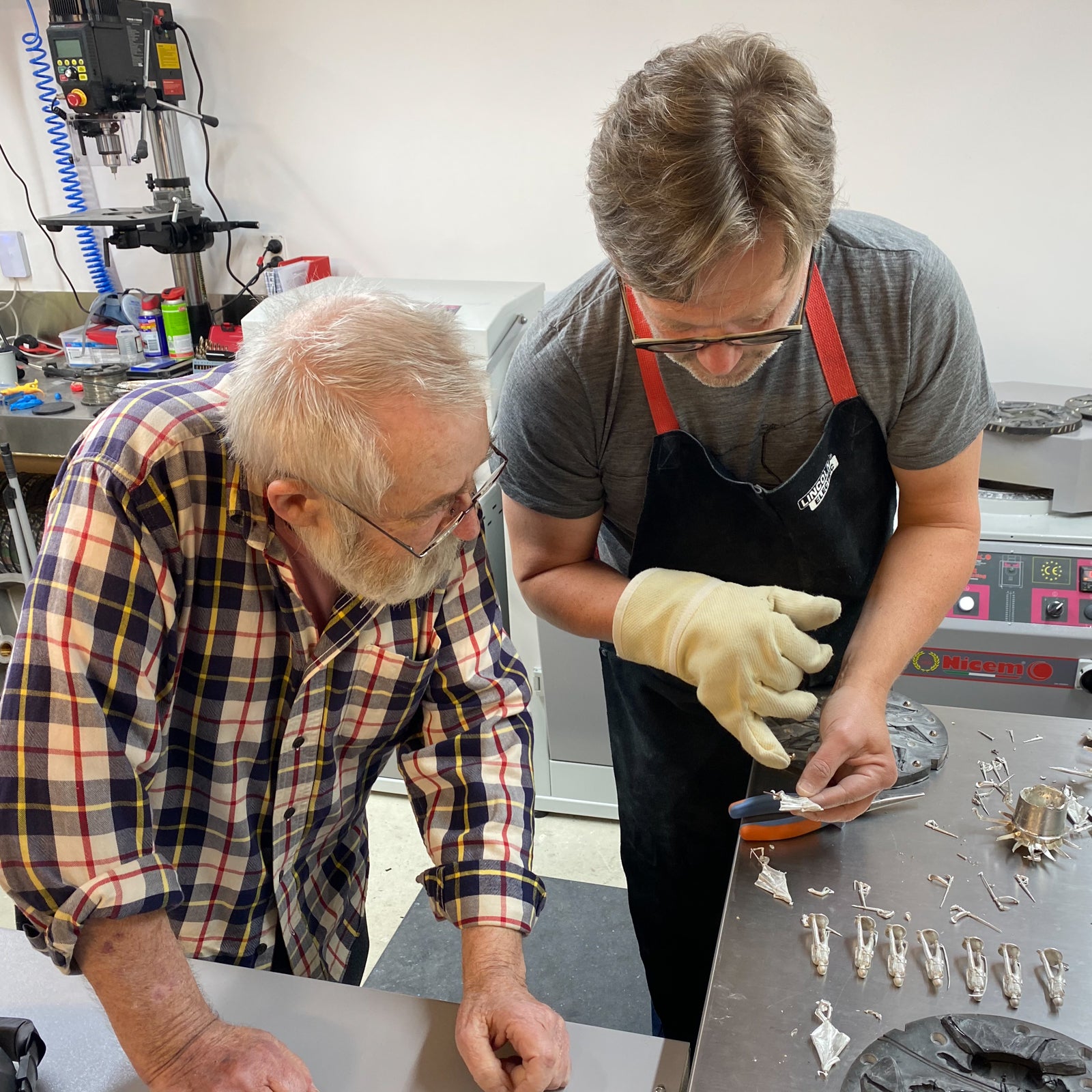 Two moulds are made; a single investment cast mould in which the master figures are made, and a production mould in which multiple copies of the masters are put into a circular silicone mould for casting.