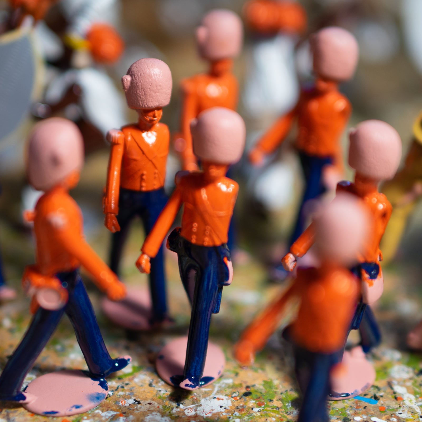 The figures and attachments are primed and painted with high gloss enamel paint. Some figures have as many as 14 different colours, each of which needs to dry before the next can be applied. Horses are spray painted to create natural fade effects.